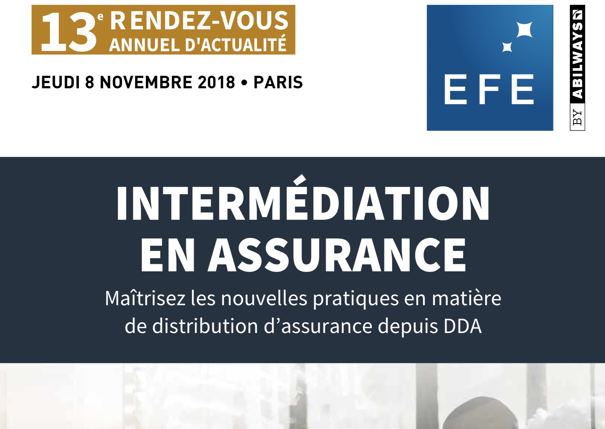Le 8 novembre 2018 : Conférence annuelle EFE sur l’intermédiation en assurance Par Pierre-Grégoire MarlyDans Agenda7 novembre 20181 mn de lecture L Comme chaque année, je présiderai le 8 novembre prochain la Conférence annuelle EFE sur l’intermédiation en assurance. Cette année encore, j’ai la chance d’être entouré des plus éminents spécialistes que je remercie par avance !