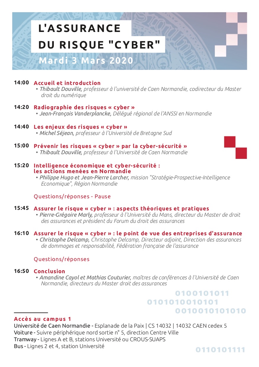 Le 3 mars prochain, j’aurai l’honneur et le plaisir d’intervenir au colloque organisé par l’Unversité de Caen sur un thème qui m’est cher : L’assurance du risque « cyber »