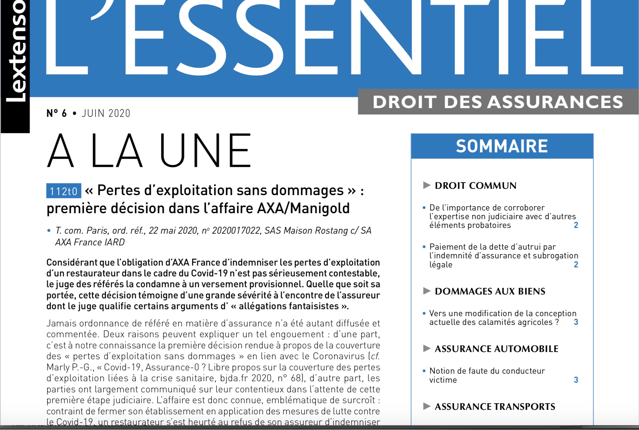 Retrouve en Une de l’Essentiel du droit des assurances (Juin 2020) mes observations sous l’ordonnance de référé rendue par le Président du tribunal de commerce de Paris dans l’affaire AXA c/ Manigold.
