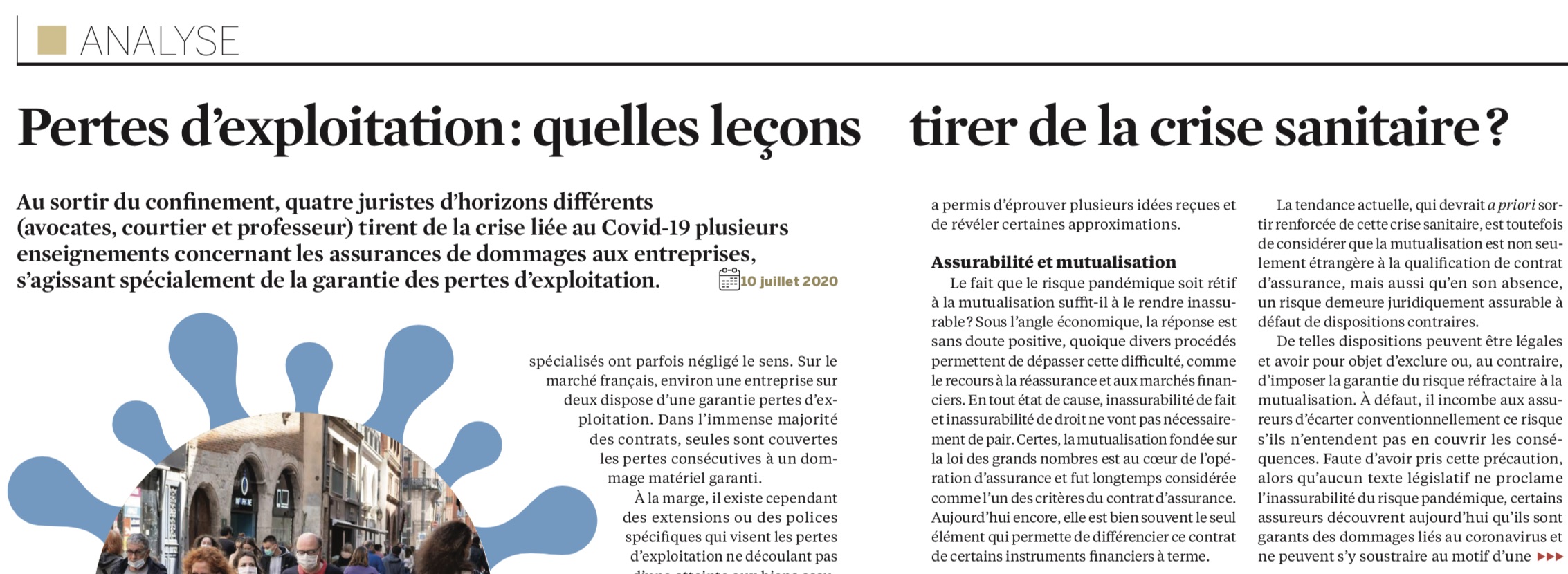 Paru dans le numéro 7666-7667 de l’Argus de l’assurance « spécial Covid-19 », l’article que j’ai eu le plaisir de co-écrire avec mes complices Christophe Pardessus (Marsh), Emmanuèle Lutfalla et Deborah Azerraf (Signature Litigation), sur les enseignements que le droit des assurances peut tirer de la crise sanitaire, que ce soit sous l’angle conceptuel (notions d’assurabilité et de dommages) ou contractuel (rédaction et articulation des clauses).