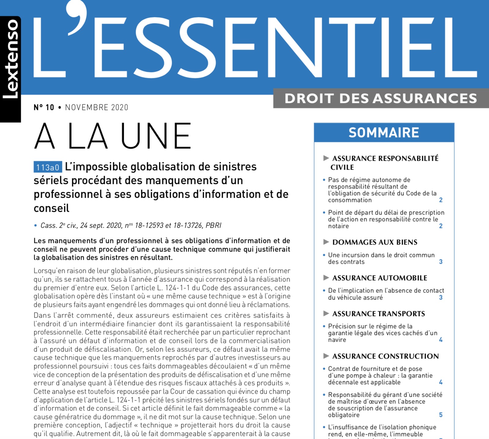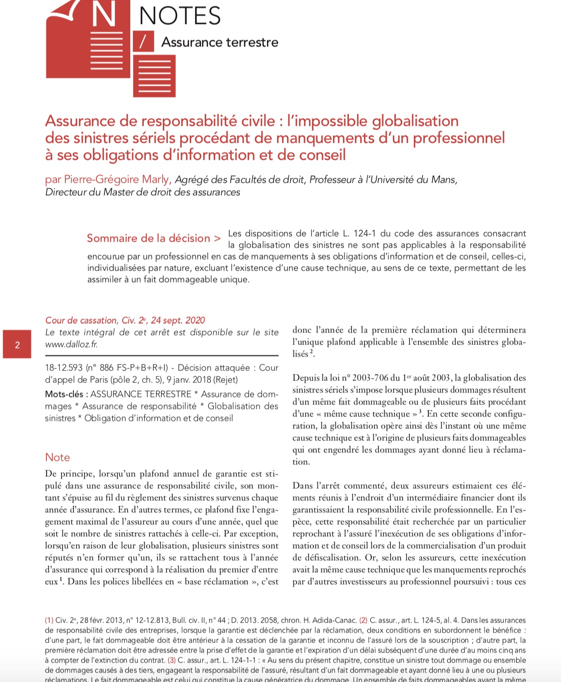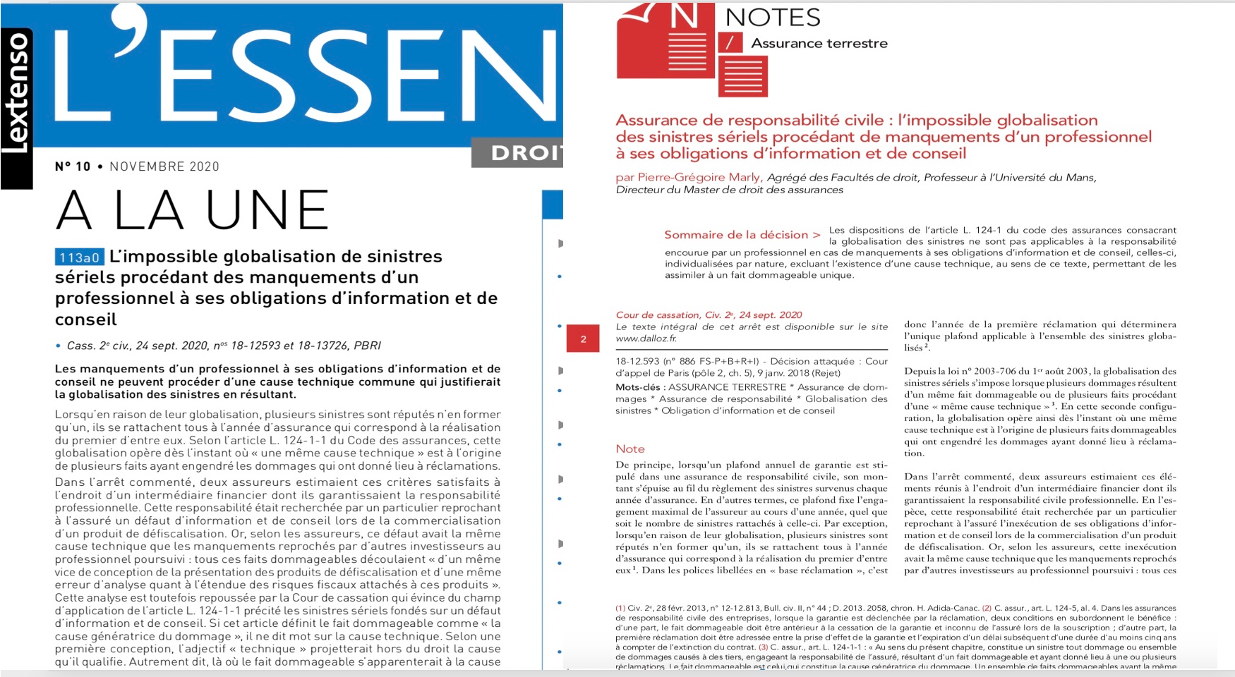 Globalisation des sinistres et défaut de conseil : Civ.2, 24 septembre 2020, 18-12.593 18-13.726, Par Pierre-Grégoire MarlyDans Articles et Notes, Publications8 novembre 20201 mn de lecture G A paraître dans l’Essentiel du droit des assurances et en version longue dans le Recueil Dalloz, mon commentaire de l’arrêt rendu par la Deuxième chambre civile le 24 septembre 2020 (18-12.593 18-13.726) EXTRAITS