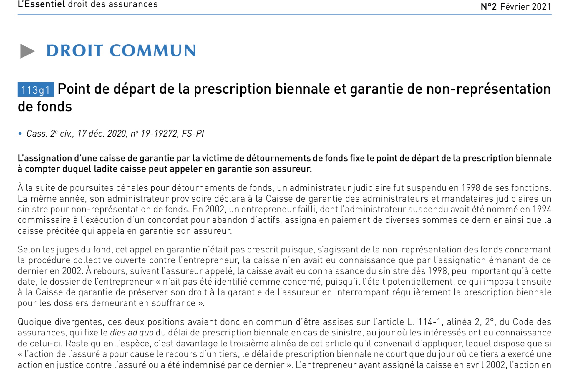 Point de départ de la prescription biennale et garantie de non-représentation de fonds Par Pierre-Grégoire MarlyDans Articles et Notes, Publications11 février 20211 mn de lecture P A lire au numéro de février de l’Essentiel du droit des assurances, mon commentaire de : Civ.2, 7 déc. 2020, n°19-19.272, P+I