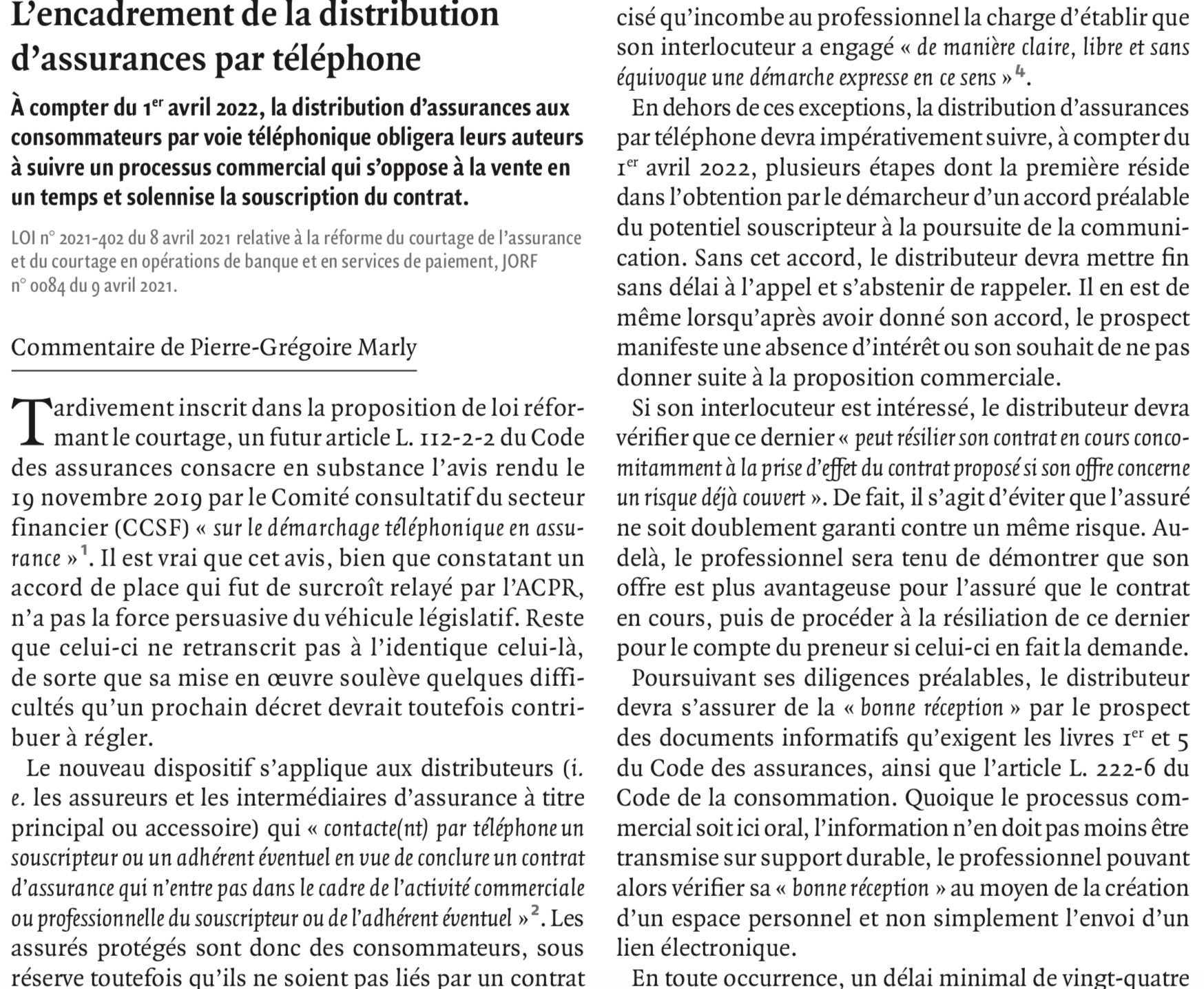 L’encadrement législatif de la distribution d’assurances par téléphone Par Pierre-Grégoire MarlyDans Articles et Notes, Publications21 mai 20211 mn de lecture L A lire dans la revue Banque & Droit n°197, mon commentaire de la loi du 8 avril 2021 qui introduit le futur article L.112-2-2 du Code des assurances.