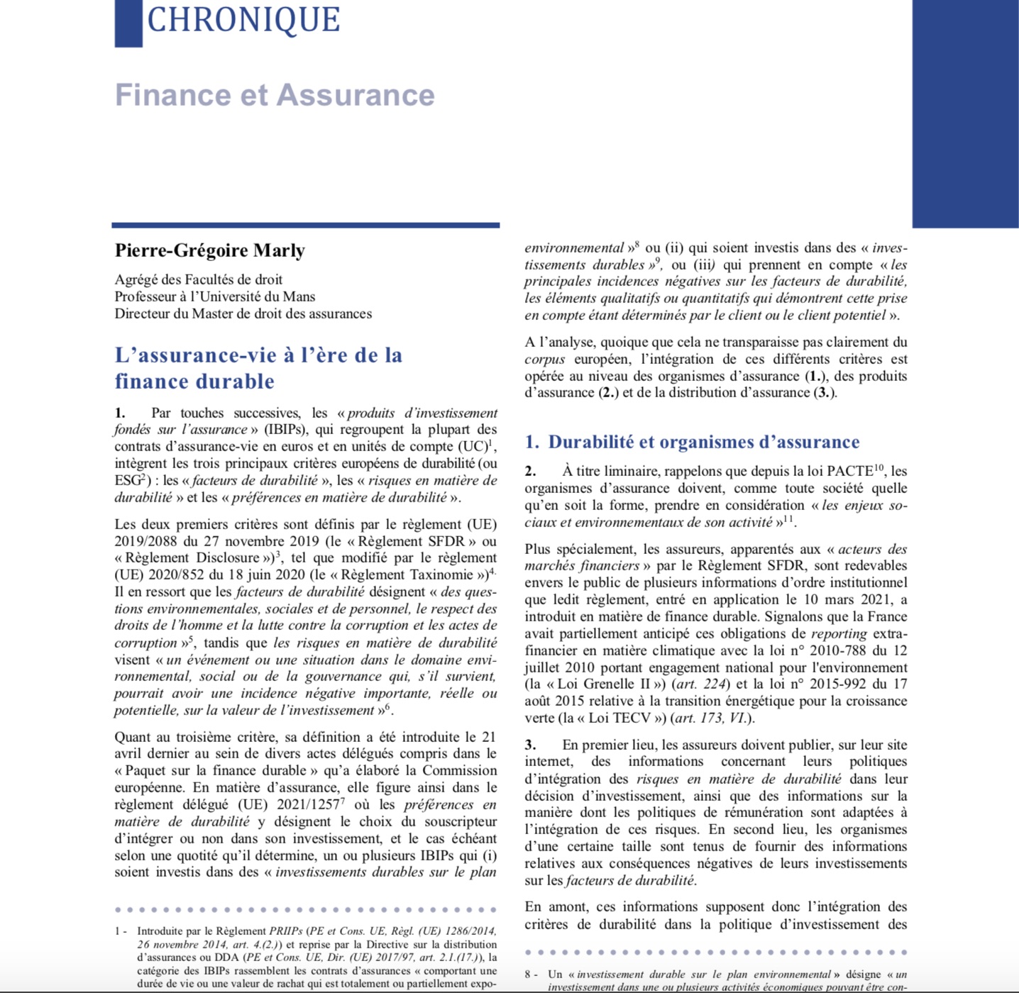 Dans la toute prochaine Revue trimestrielle de droit financier (RTDF 3-2021), je vous propose de découvrir mon étude sur le thème de « l’assurance-vie à l’ère de la finance durable ». J’y analyse l’impact de la durabilité au triple niveau des organismes, des produits et de la distribution d’assurances-vie.