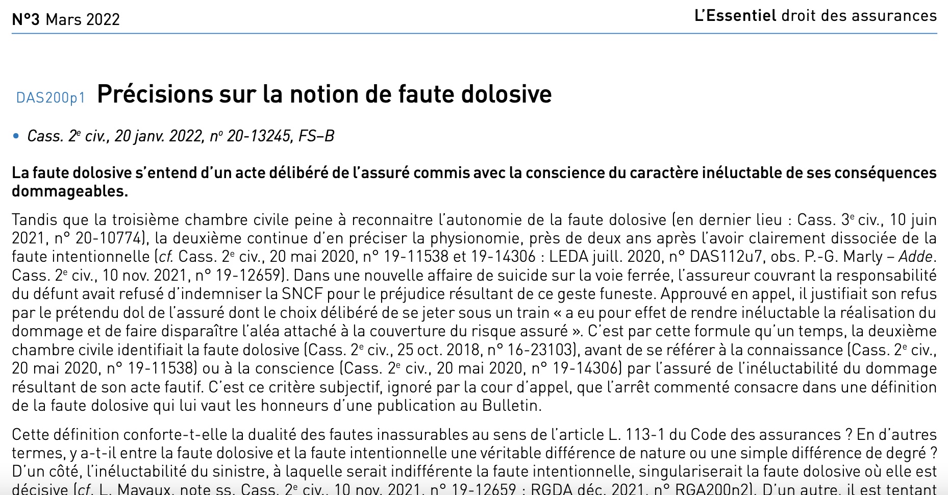 Faute dolosive : la deuxième chambre civile pose sa définition Par Pierre-Grégoire MarlyDans Articles et Notes, Publications10 mars 20221 mn de lecture F A lire dans l’Essentiel du droit des assurances du mois de mars, mes observations sous : Cass. 2e civ., 20 janv. 2022, no 20-13245, FS–B EXTRAIT :