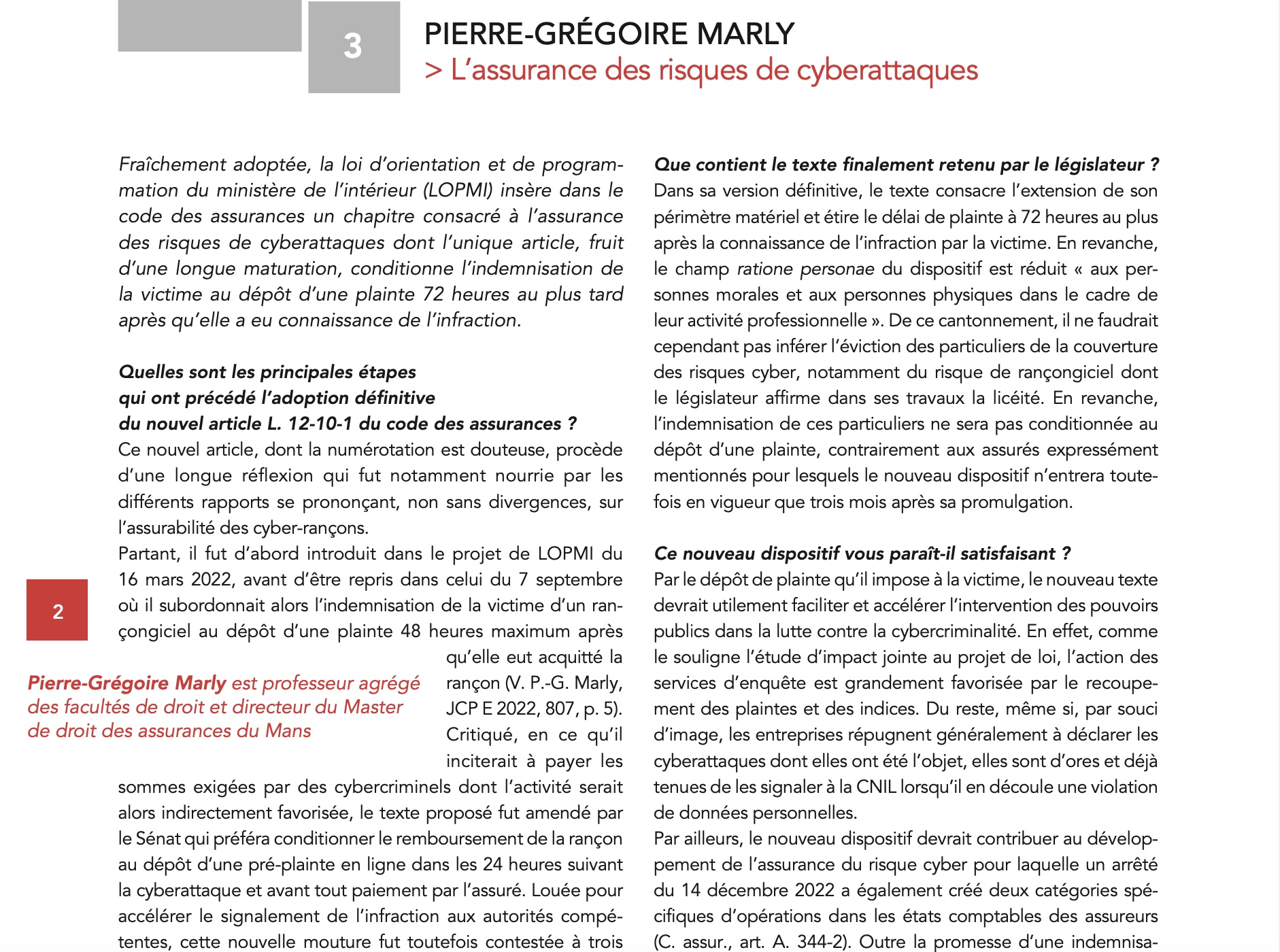Nouveau dispositif en matière d’assurance des cyberattaques Par Pierre-Grégoire MarlyDans Articles et Notes, Publications9 janvier 20231 mn de lecture N Dans le prochain Recueil Dalloz, je vous propose un entretien sur le dispositif introduit par la toute récente LOPMI en matière d’assurance des cyberattaques. EXTRAIT