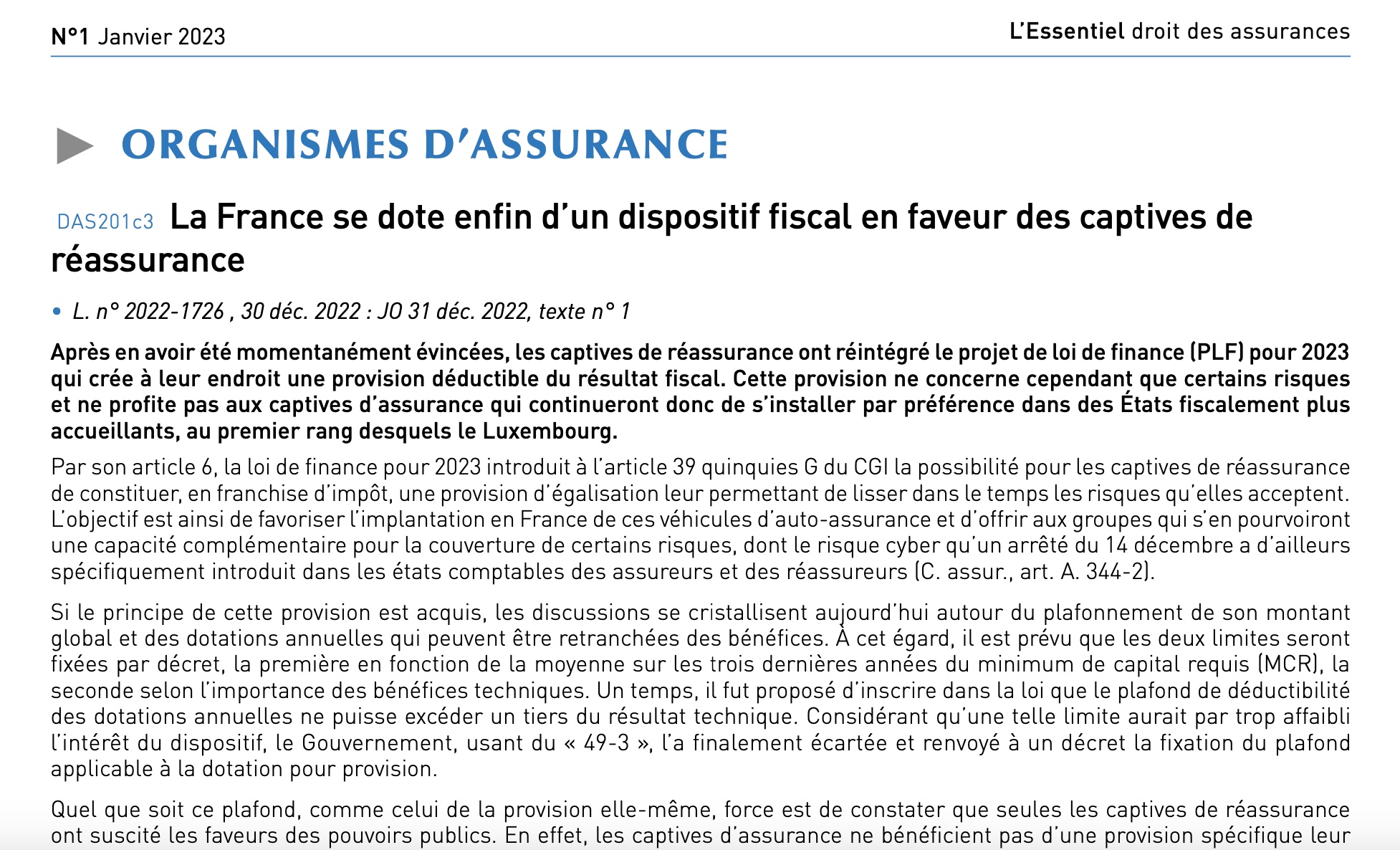 Un nouveau dispositif fiscal en faveur des captives de réassurance Par Pierre-Grégoire MarlyDans Articles et Notes, Publications17 janvier 20231 mn de lecture U A lire, dans l’Essentiel du droit des assurance de janvier 2023, mon commentaire de l’article 6 de la loi de finance qui crée au profit des captives françaises de réassurance une provision déductible du résultat fiscal. EXTRAIT :