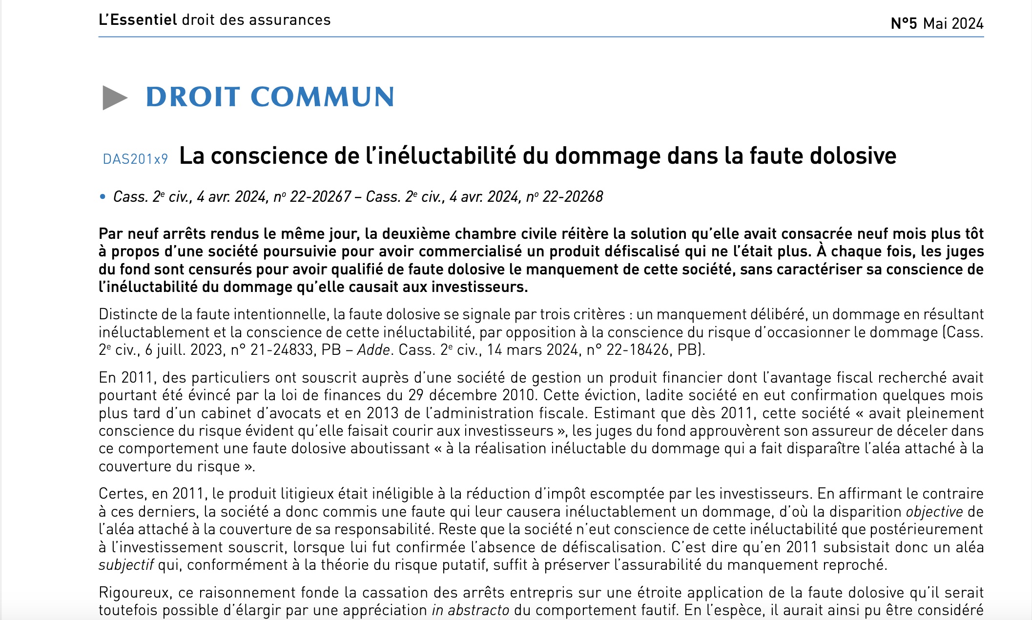 Au menu du nouvel Essentiel du droit des assurances, je vous propose quelques observations sous les arrêts rendus le 4 avril dernier à propos du caractère inéluctable de la faute dolosive.